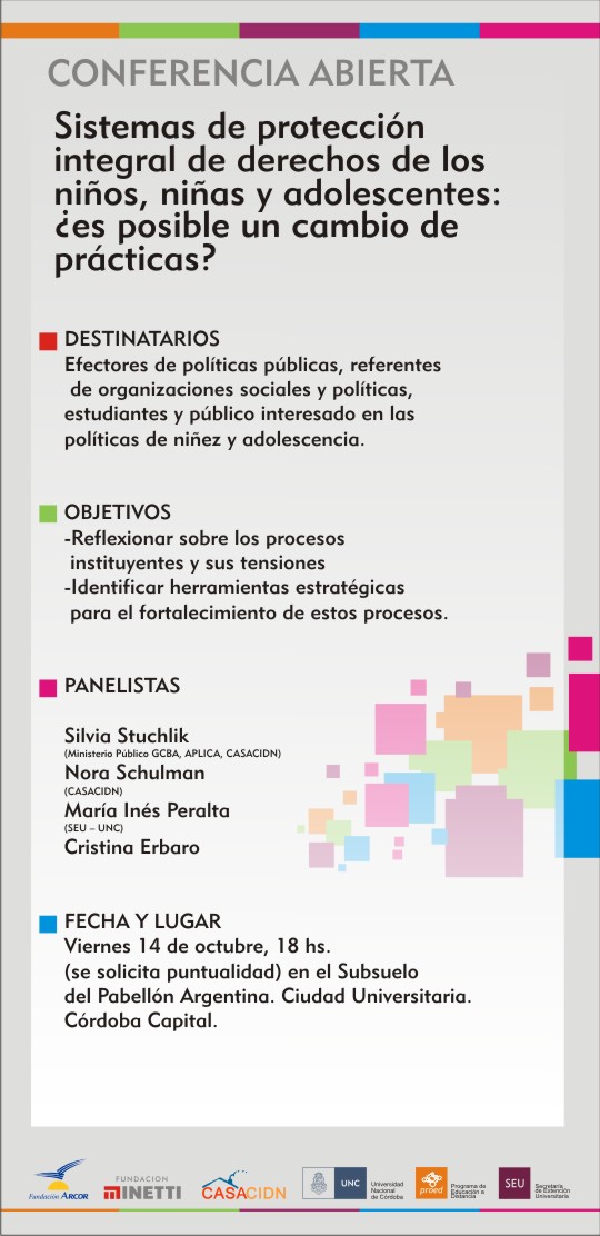 Asimismo los días 14 y 15 de octubre se realizarán en el Pabellón Argentina los encuentros presenciales del curso a distancia “Sistemas de Protección Integral de los Derechos de Niños, Niñas y Adolescentes. Recorridos y perspectivas desde el Estado y la Sociedad Civil” que se desarrolla desde el mes de mayo bajo la gestión de la UNC, CASACIDN, Fundación Minetti y Fundación Arcor.