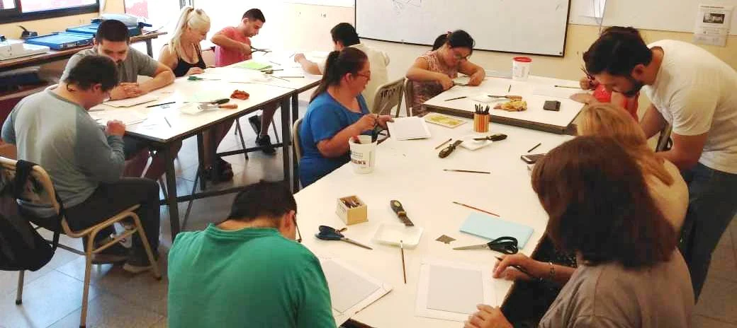 Algo similar se vivió también el lunes 9 de diciembre. Esta vez el turno fue del grupo que cursa la especialización en Artes Aplicadas y Encuadernación, acompañados por el profe Germán Tartara. Allí con procedimientos similares, también las personas invitadas aprendieron técnicas de encuadernación y de impresiones manuales y artísticas. Y trabajaron y aprendieron todos juntos.